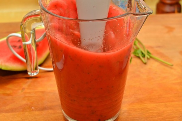 Удалить кожу и семена из арбуза, нарезать кубиками и положить в блендер. Добавить листья мяты и меда, а также кубики льда, если ваш блендер может с ними справиться.