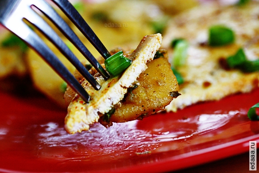 #5 Теперь выкладываем порционно на тарелочки картофель и стейки. Украсить блюдо свежим зеленым луком.