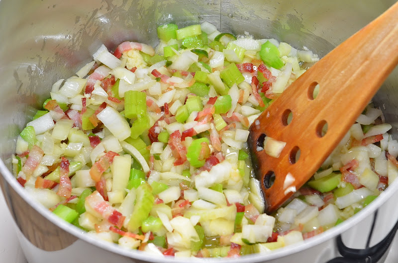 #6 Переложите бекон в кастрюлю. Добавьте первую овощную смесь. Добавьте измельченный чеснок. Варить на медленном огне в течение 10 минут.