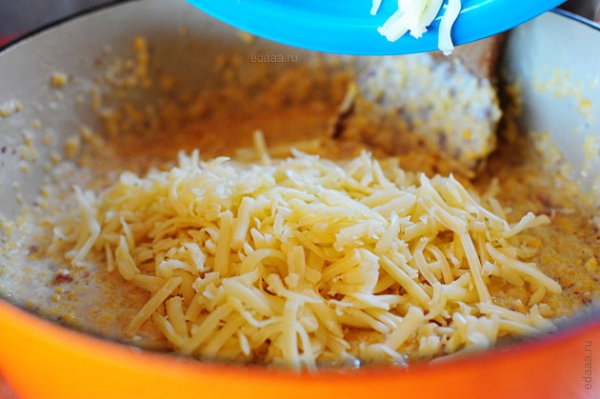 #3 Добавляем тертый сыр, накрываем крышкой и тушим еще несколько минут пока сыр не расплавится. Соус готов.