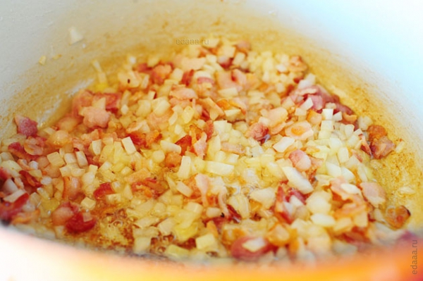 #1 Лук и ветчину мелко нарезаем ножом. Обжариваем до золотистого цвета.
