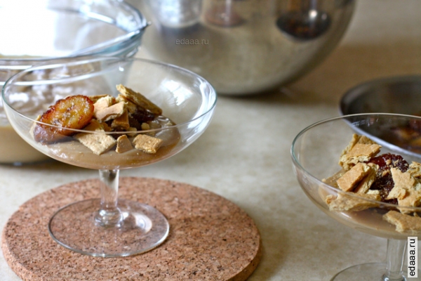 #4 В креманку положить пудинг, сверху выложить сладкие бананы с виски и присыпать разломанными крекерами.