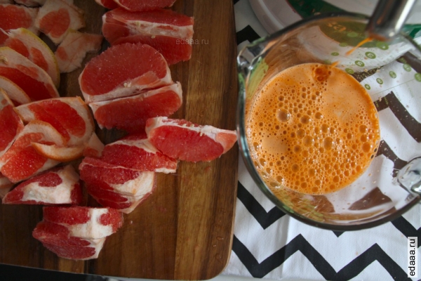 Очищаем морковь, отправляем ее в соковыжималку. Выдавливаем сок из грейпфрута.